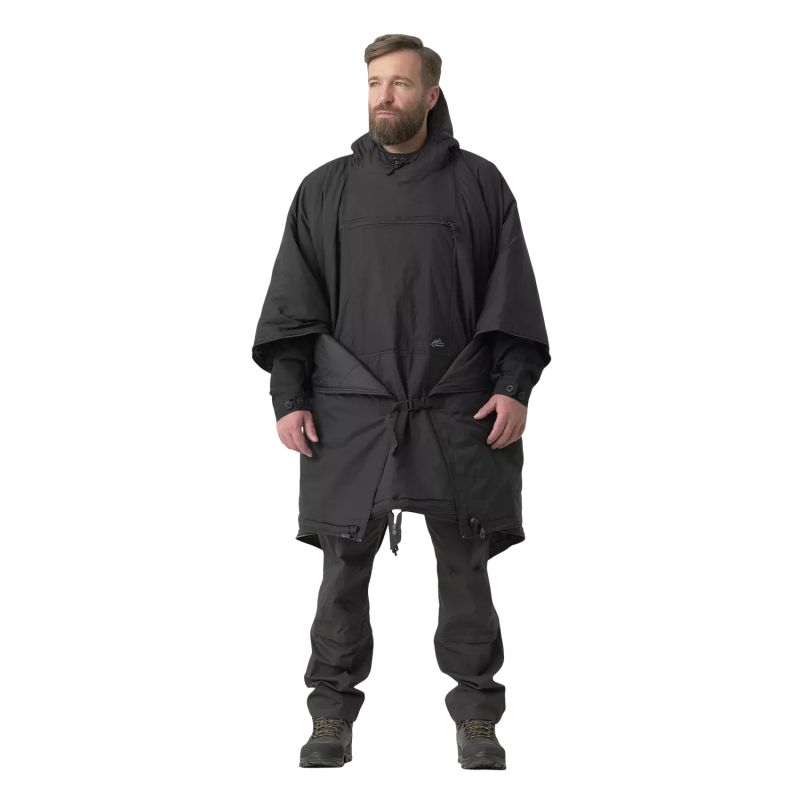 Самое очевидное и простое применение Swagman Roll® — в качестве пончо. На талии есть эластичные ленты, которые, будучи застегнутыми, плотно прилегают к телу, напоминая импровизированную куртку-анорак с большим передним карманом. Оно защищает от холода благодаря современной изоляции Climashield® Apex™ весом 67 г/м², которая сохраняет тепло даже во влажном состоянии. В сочетании с нашим пончо модели US Swagman образует двухслойную конструкцию: внутренний слой обеспечивает тепло, а внешний — защиту от дождя.